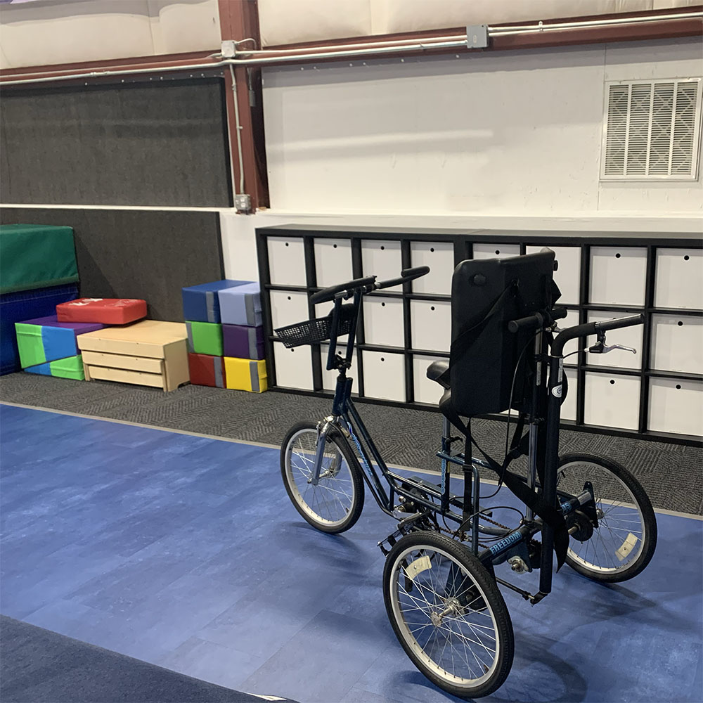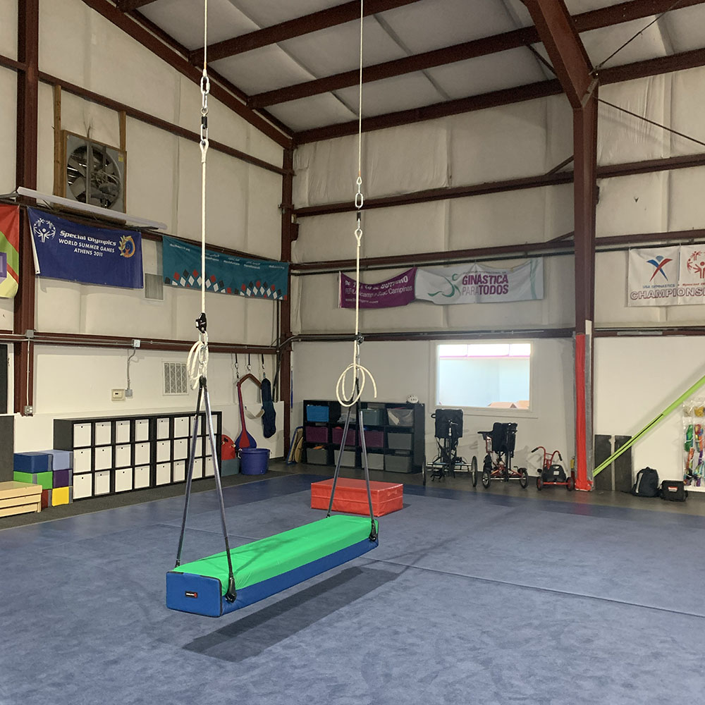 The in-ground trampoline, therapy swings, adaptive therapeutic bikes, and beams, etc. provide endless opportunities to advance the level of challenge and fun.